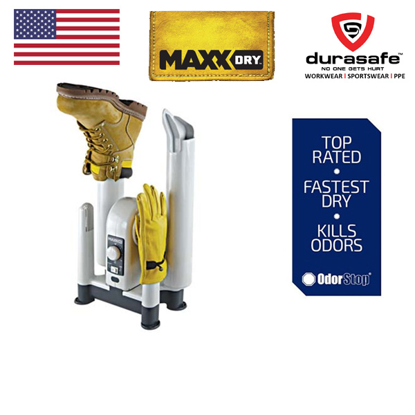 Never wear damp or sweaty boots or gloves again. The MaxxDry™ Heavy-Duty Dryer uses whisper-quiet, forced-air technology to safely dry a pair of boots and gloves-without stiffness or shrinkage-in about one hour. Ideal for preventing bacteria and mold that can grow in moisture and perspiration that can cause odors or shorten product life. Mild heat (or no heat) dries leather, canvas, breathable Hypalon®, Neoprene, polyester microfiber, woven nylon, vinyl, rubber, plastics or other synthetic materials.