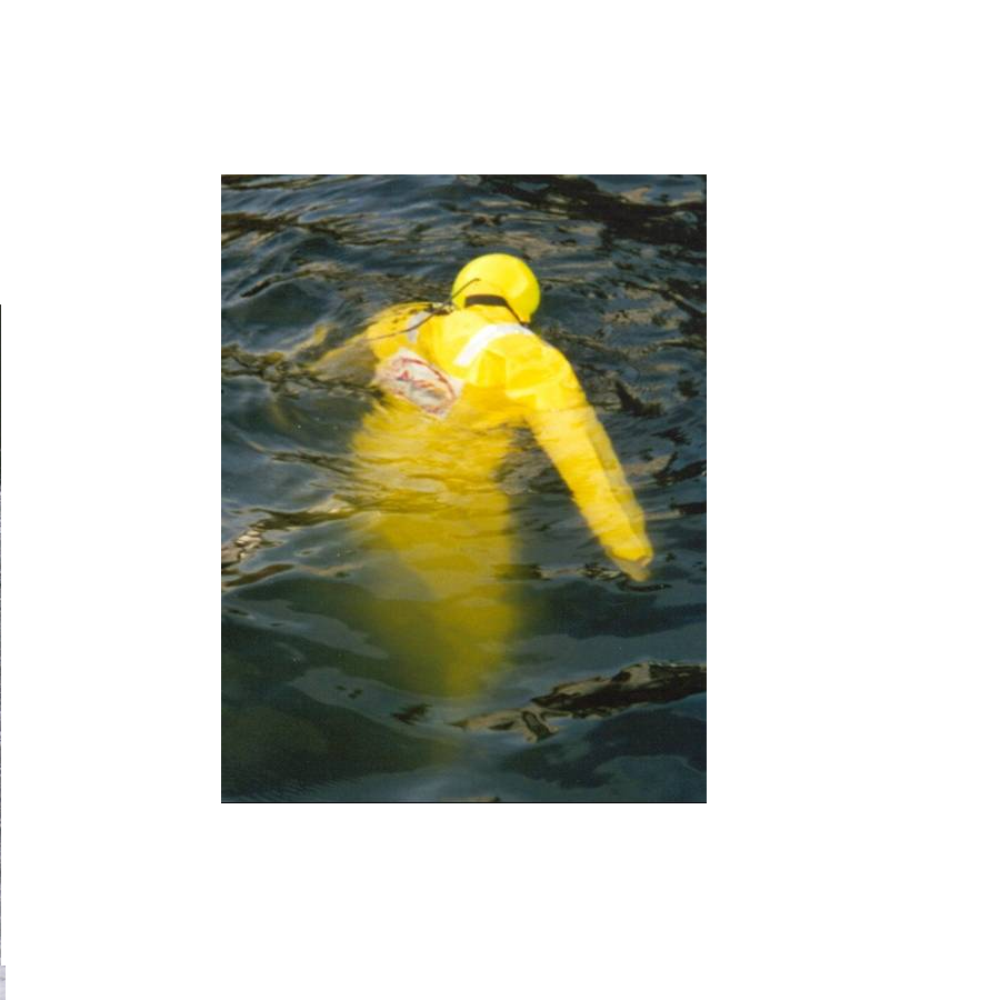 The Dacon Rescue Dummy is supplied with a specially designed cover-all incorporating a Flotation Position Control system allowing the Dummy to float either horizontally or vertically for variation in rescue technique.