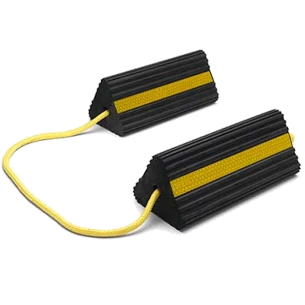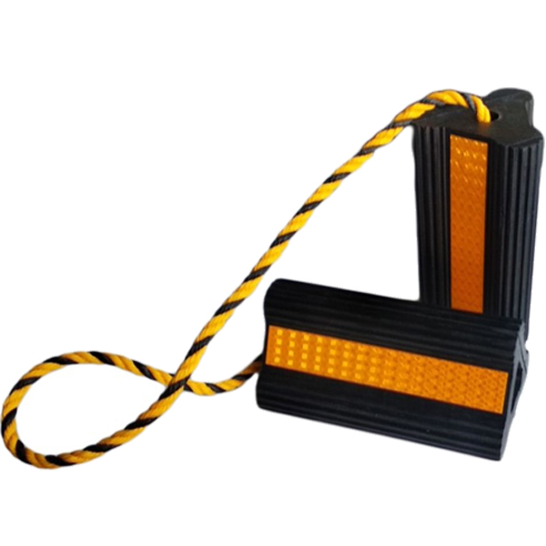 The material of which the wheel blocks is made is EPDM rubber. A wheel block set consists of two wheel blocks, fitted with 3M reflective strips and a yellow colored braided cord.
