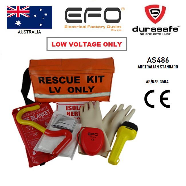 The LV Switchboard Rescue Kit is designed to be used by a safety observer for the safe rescue of victims of electrical shock and other injuries when working on Low Voltage switchboards and substations. The kit is designed to comply with Australian Standard AS4836 requirements Safe Working On Low Voltage Electrical Installations. Compared to other LV Rescue Kits available,  the EFO Rescue kits offer the highest specification on the Market. Features include a double insulated Fiberglass Rescue Crook, Glow in the dark Strip on the bag. We also we include a CPR mask and thermal shock blanket as standard.