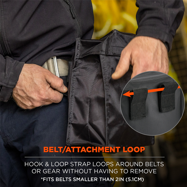 The belt loop design features a hook & loop strap, making it easy to attach or detach the bag without having to remove belts or unclip anchoring locations. Simply undo the loop, wrap around and refasten to keep respirators within reach, both increasing safety and improving compliance. The hook & loop closure easily opens with one hand for immediate access.
