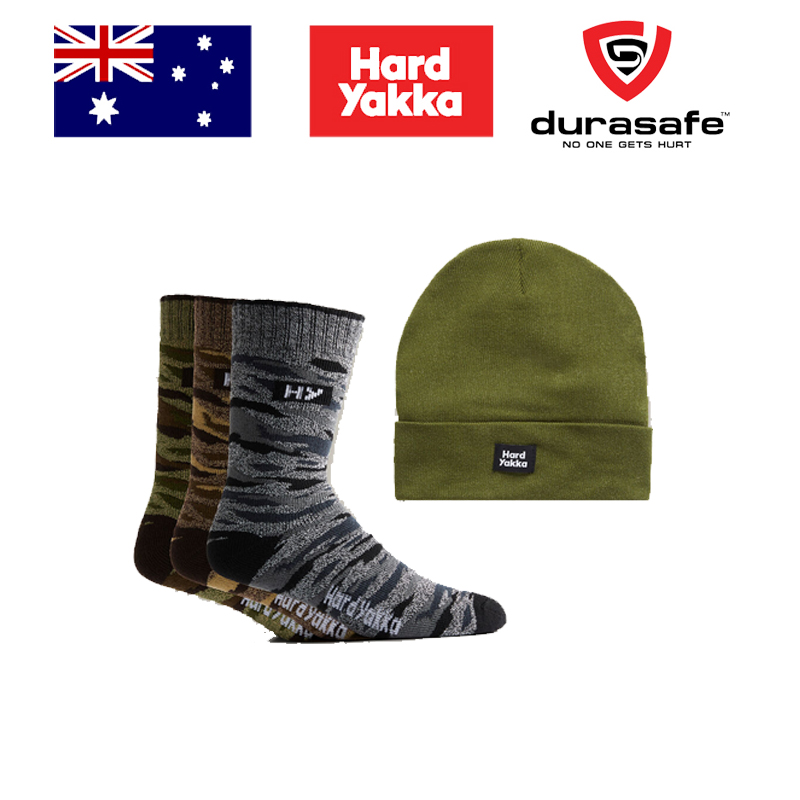 This socks + beanie bundle gives you an easy way to keep warm and comfortable at work. The socks are a Camo design and the beanie is a matching military green. Both are made with 85% recycled polyester. Stock up today.