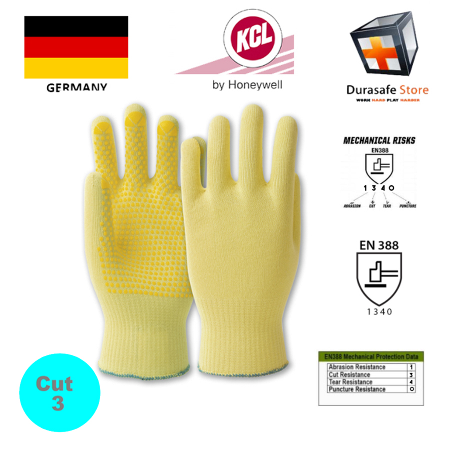 Because of the light knitwear the glove is kept breathable and does not cause any fatigue of hand. The glove provides PVC-dots on the palm for a better grip and a high sense of touch and at the same time a high cut protection. Para-aramide can be cleaned several times without losing the mechanical protection properties. The instruction for use shows the user how to clean the glove after use.