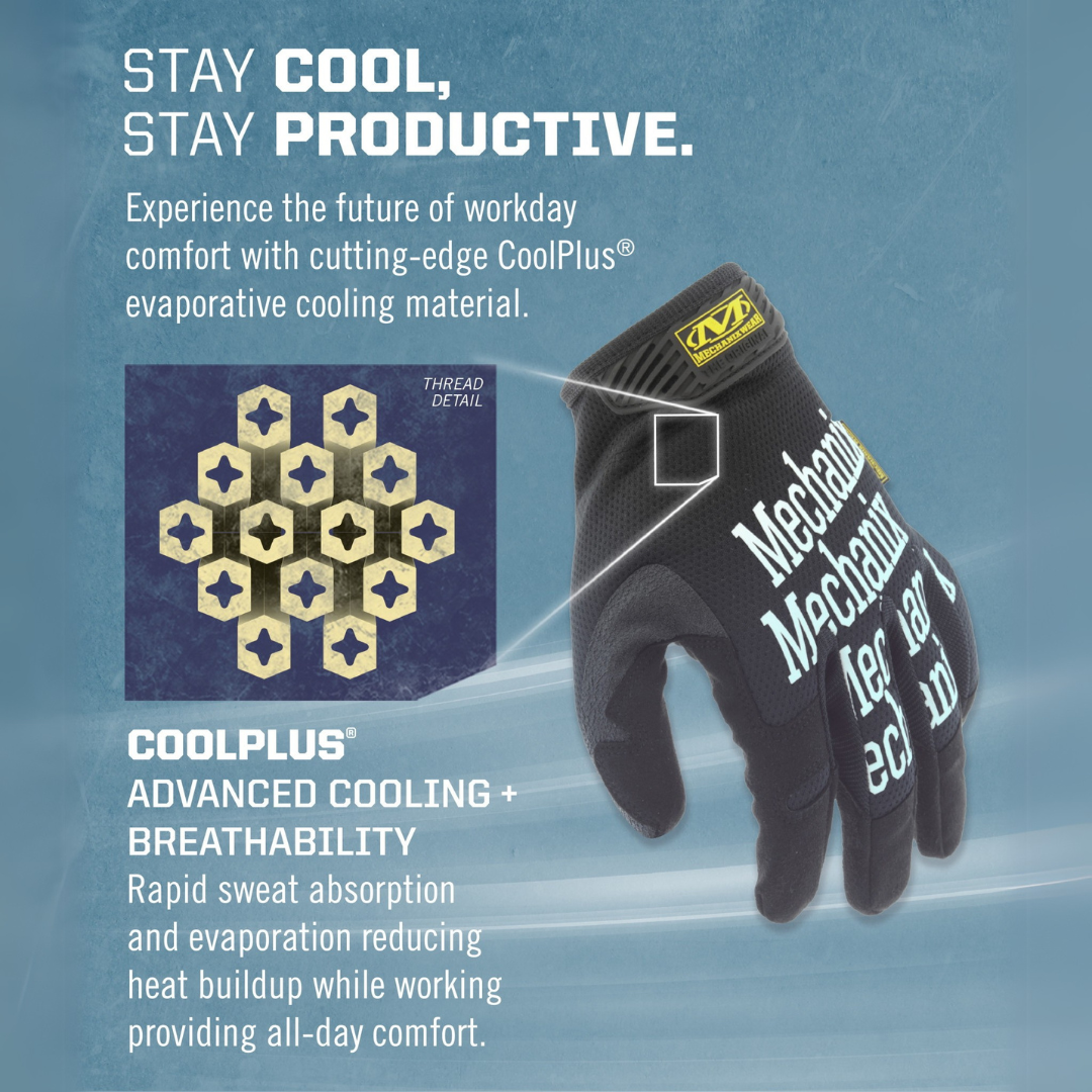 • CoolPlus® woven-mesh back of hand reduces heat buildup while working