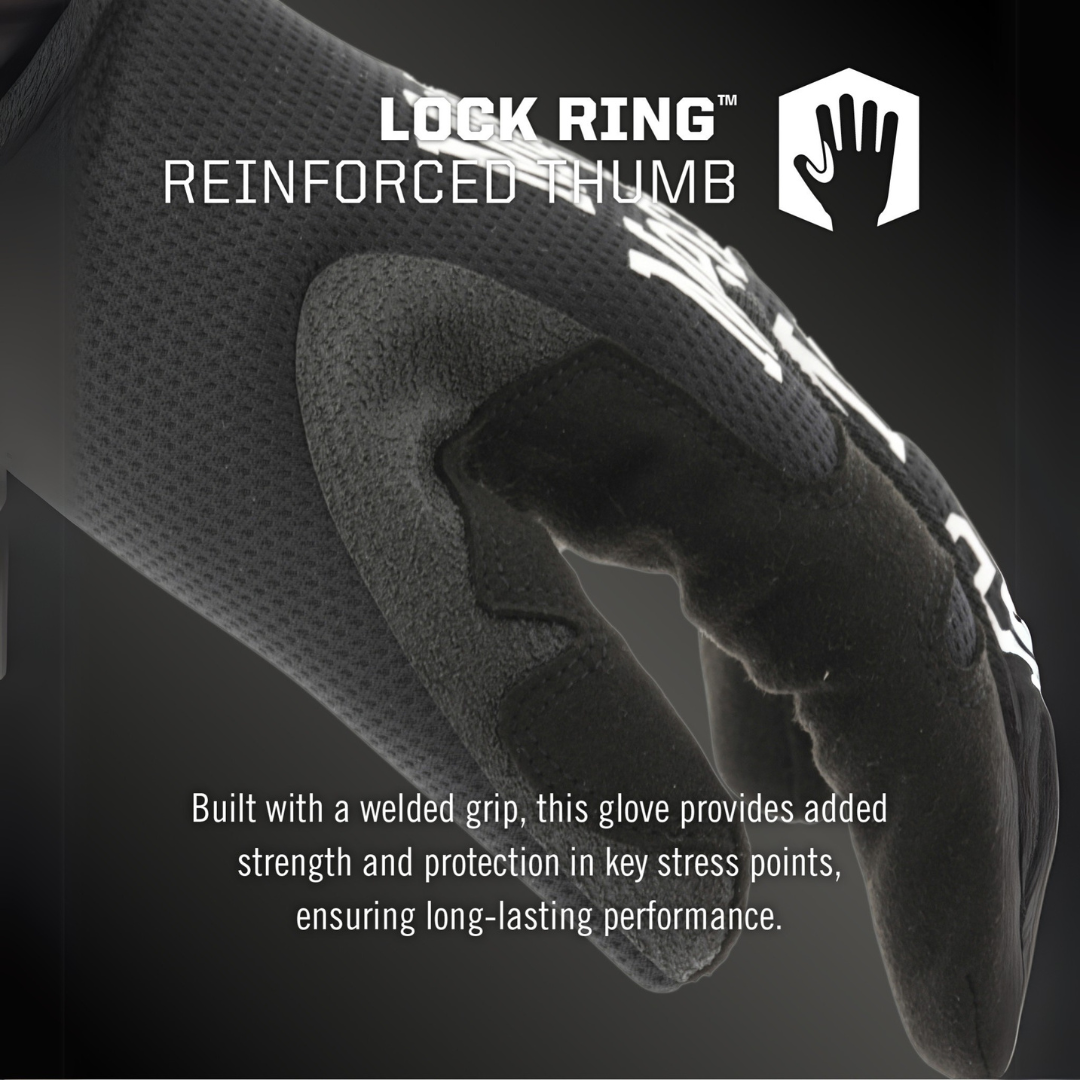 • Welded Lock Ring™ grip thumb panel design wraps high wear thumb saddle area increasing durability and reducing vulnerable stitching