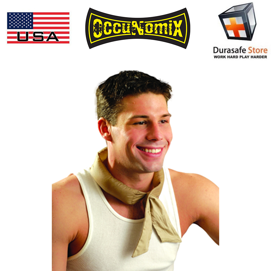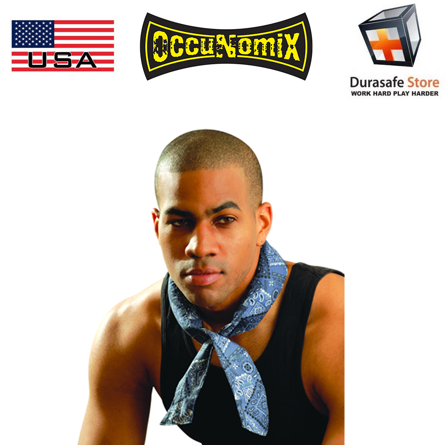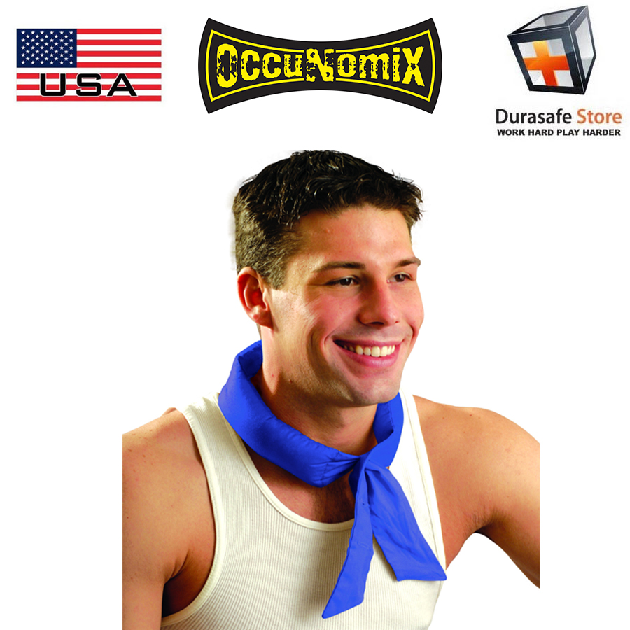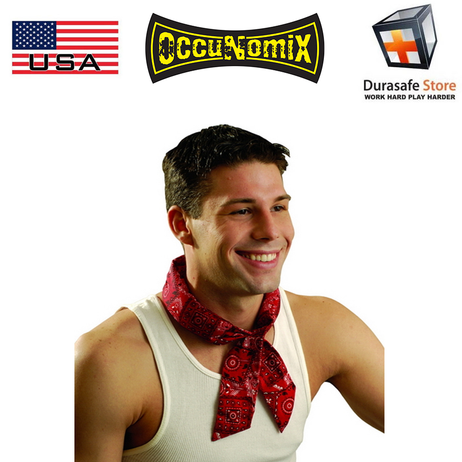 When temperatures are on the rise, workers can cool off with this unique bandana. Lightweight and comfortable with 100 percent absorbent cotton, the bandana is filled with innovating crystals. The crystals hold cold water, up to 1000 times their weight, for several days at a time. No freezing is required, just soak the bandana in cold water for 10 to 20 minutes before use.