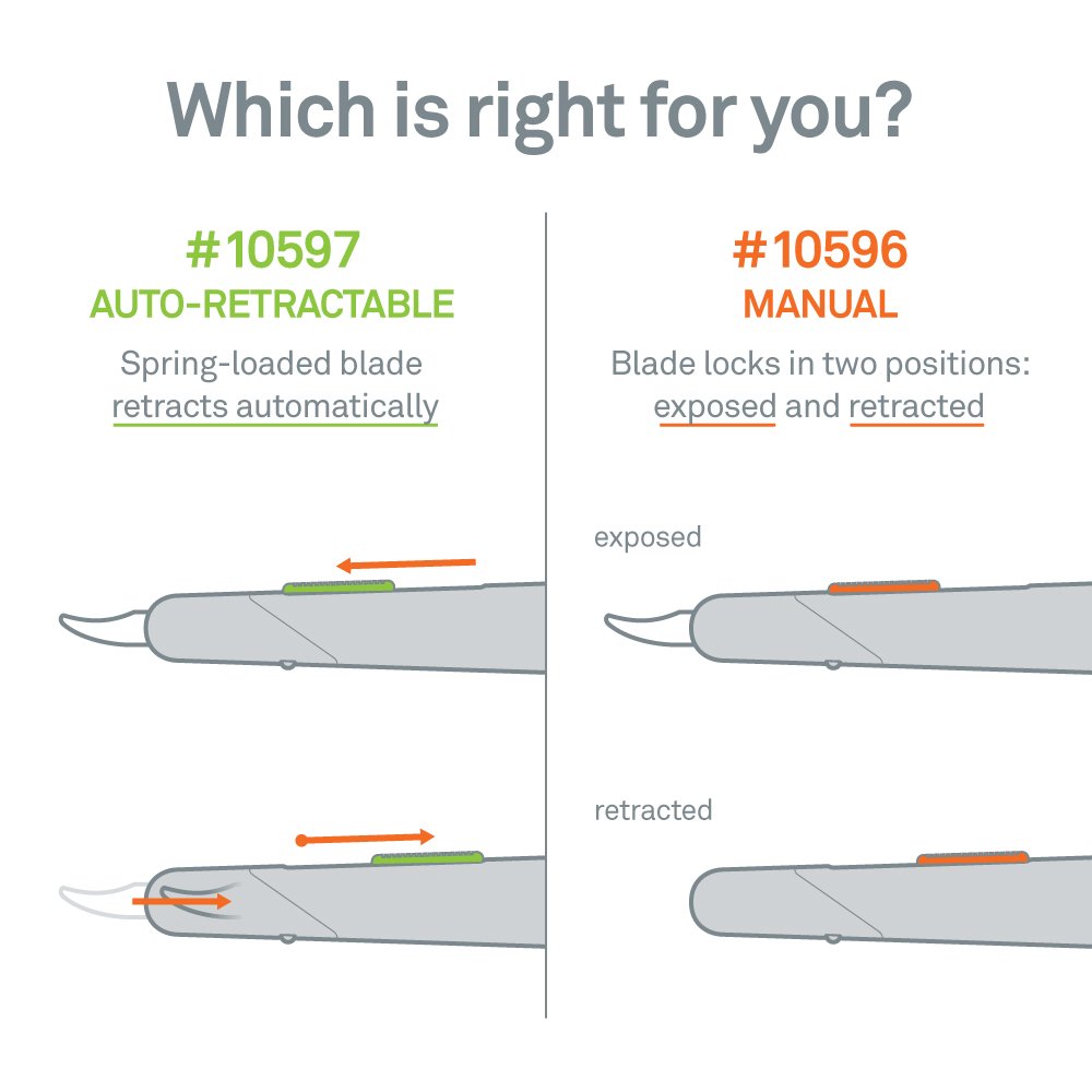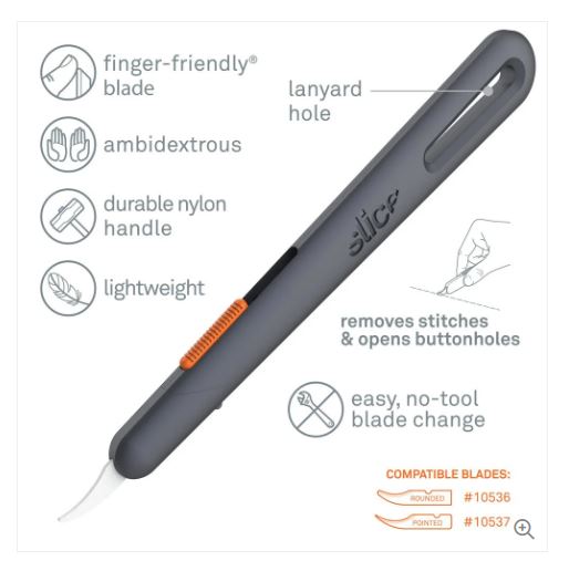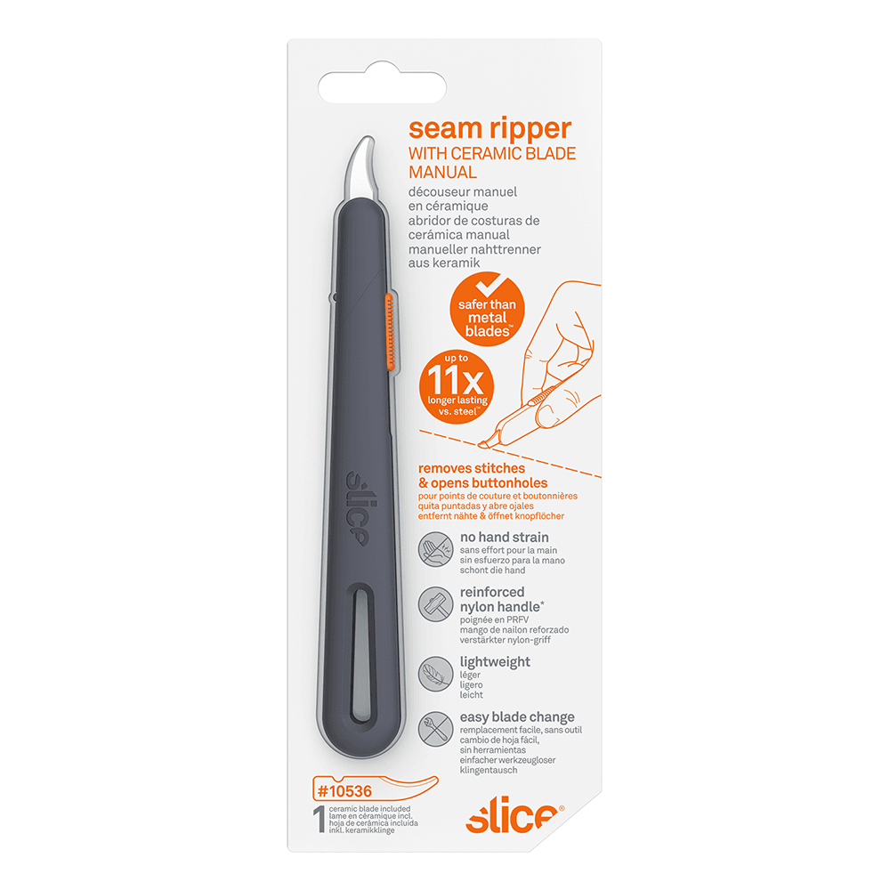 The Slice® 10596 Manual Seam Ripper offers a choice of three pre-set blade positions: fully retracted, partially extended, and fully extended. Its replaceable blade is chemically inert, never rusts, and lasts up to 11 times longer than a comparable steel blade. The installed finger-friendly® blade is safe to the touch and easy to clean so it won’t stain thread or fabric. Constructed of durable reinforced nylon, the lightweight handle is designed for comfortable, easy use and features a lanyard hole to keep your 10596 close by while you’re working. No extra tools are needed to change the blade.