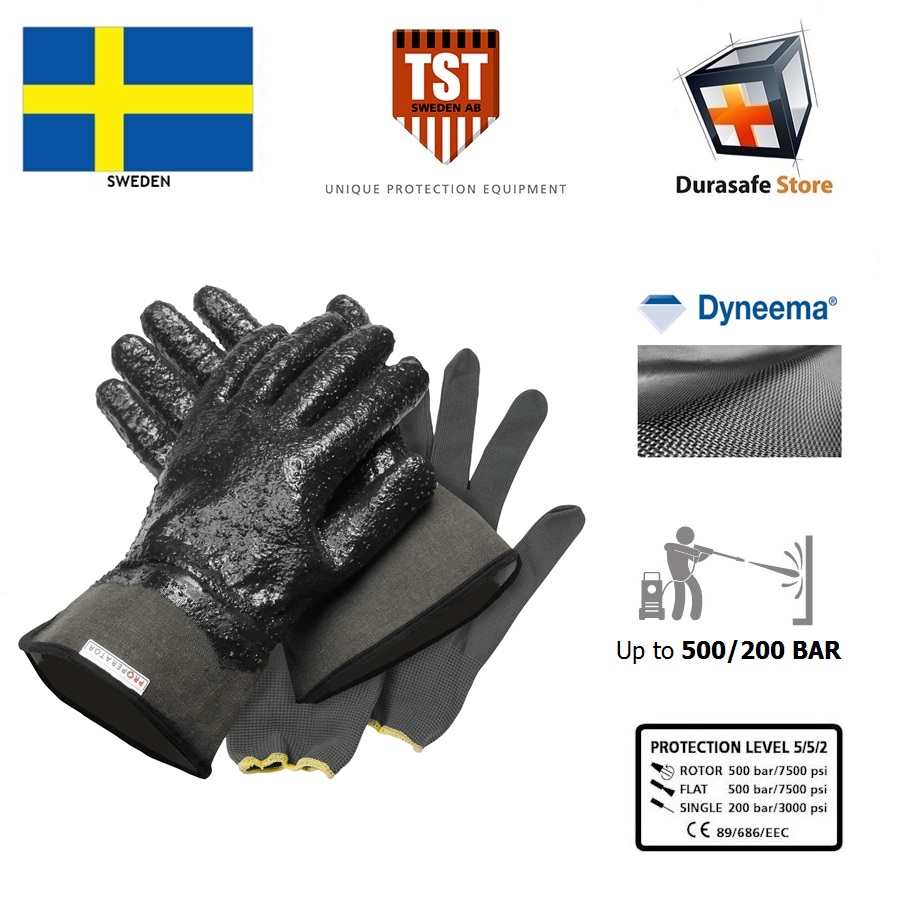 The TST Safety Gloves are the latest in high pressure water protection. They protect the hands from dangerous water strikes up to 7500PSI. The gloves are made with Dyneema, which is a fiber 15 times stronger than steel on a weight for weight basis. This material allows the gloves to be extremely protective, without compromising on flexibility and comfort.