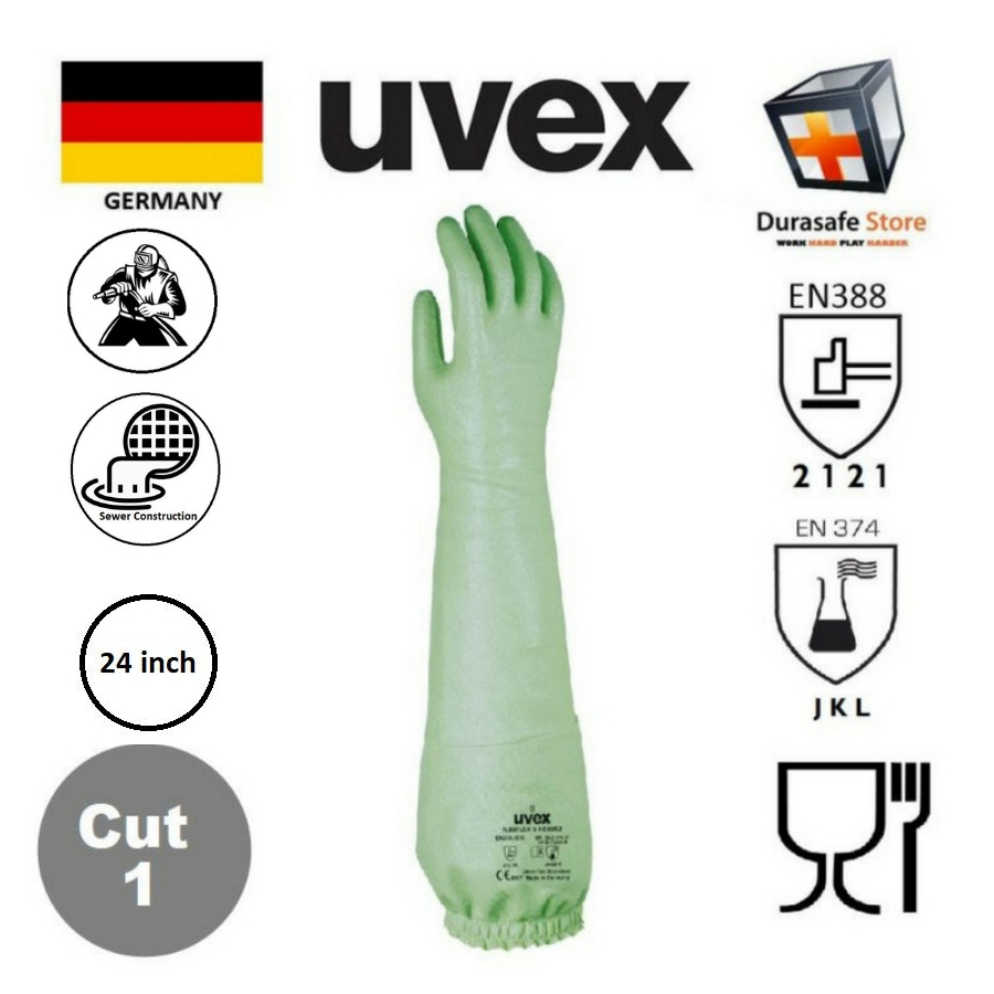 For these chemical protection gloves, a thicker cotton interlock lining is used. This makes the Uvex Rubiflex S suitable for many applications in which protection against chemicals and increased mechanical protection (for example against heat) is required. The special 60 or 80 cm version is also available with elasticated gauntlet end.
