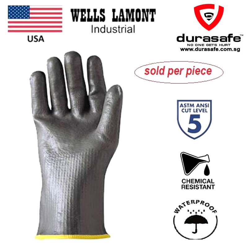 • Stainless steel wrapped in high strength fibers and coated with a moisture resistant rubber coating provides cut and liquid/chemical protection